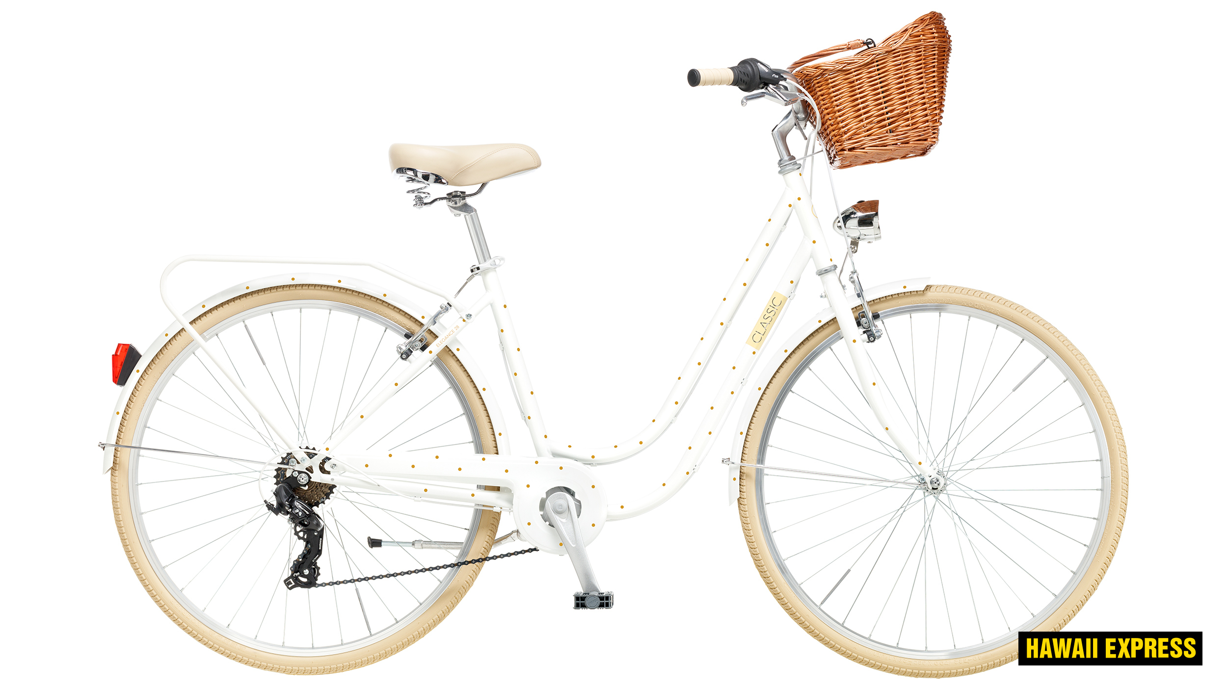 | Extras | fenders, chain guard, luggage rack, basket, front/rear lights, kickstand, bell, reflectors |