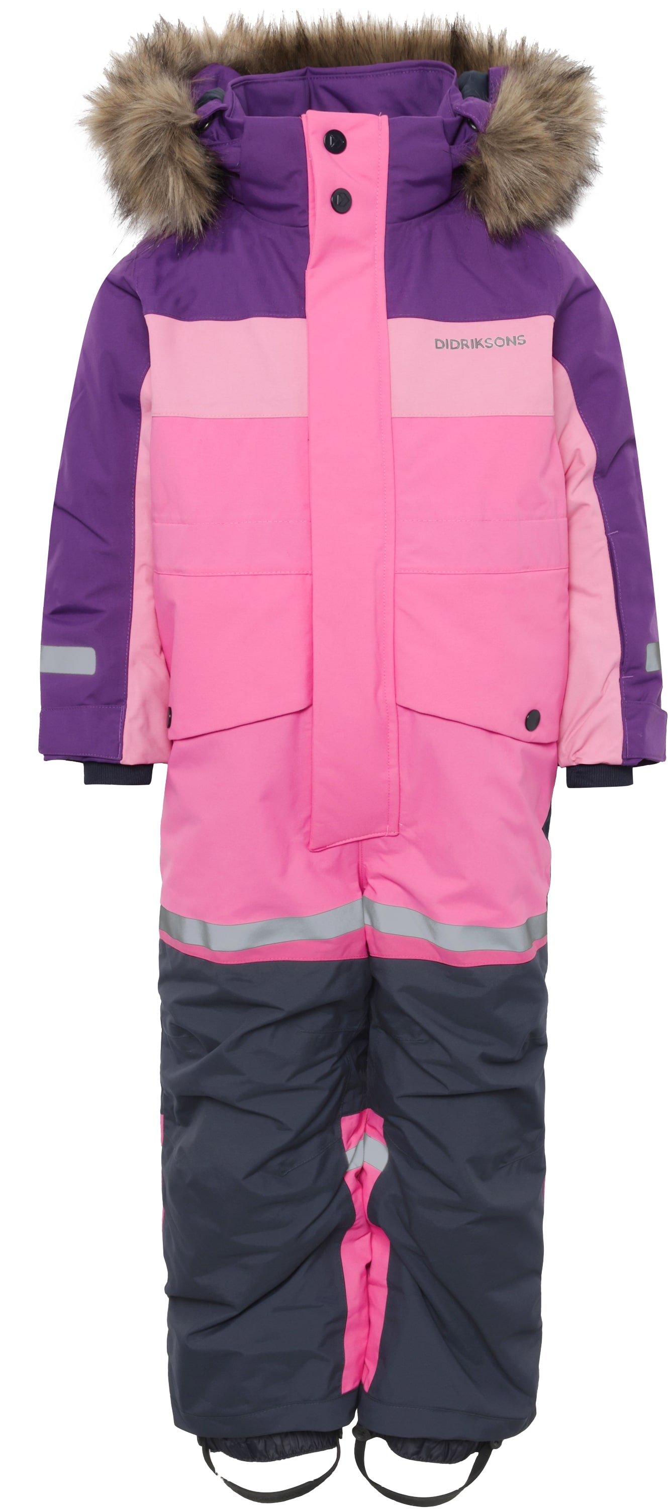 Eemaldatav kapuuts sünteetilise karvkattega, takjakinnitusega varrukaotsad ning silikoonist jalaaasad ja libisemisvastased lumelukud hoiavad kombinesooni kindlalt paigal.