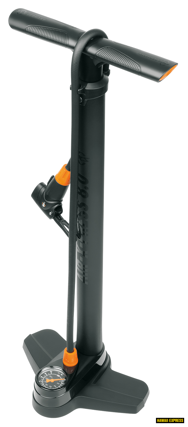 Pumbal on integreeritud täpne manomeeter (näidud bar ja PSI), mis võimaldab rehvirõhku mugavalt jälgida ja reguleerida.