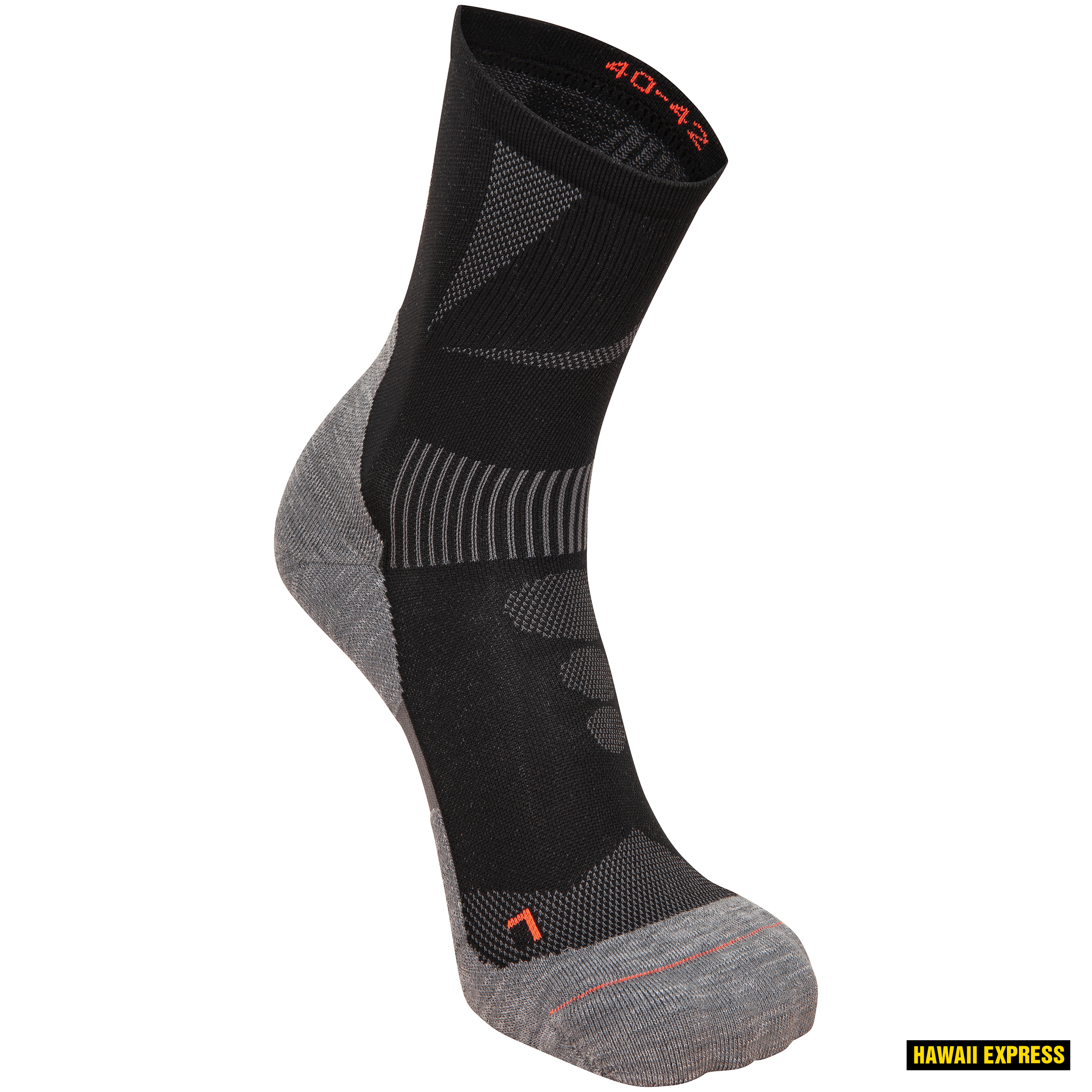 Poolkõrge, niiskust imav meriinovillasegu. Temperatuuri reguleeriv kangas. Kompressioonkaar, anatoomiliselt kujundatud, polsterdatud tald löögikaitseks, lame varbaõmblus hõõrdumise vähendamiseks. Võrkkoega ventilatsioonialad